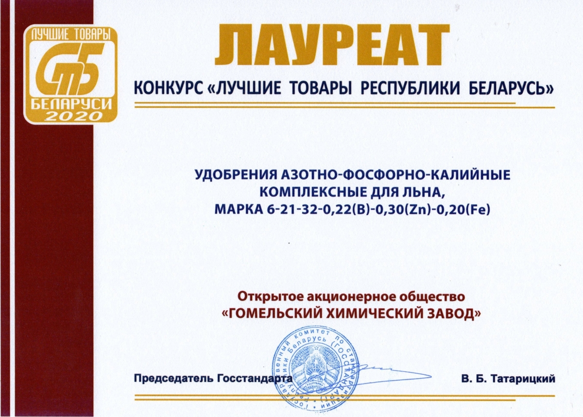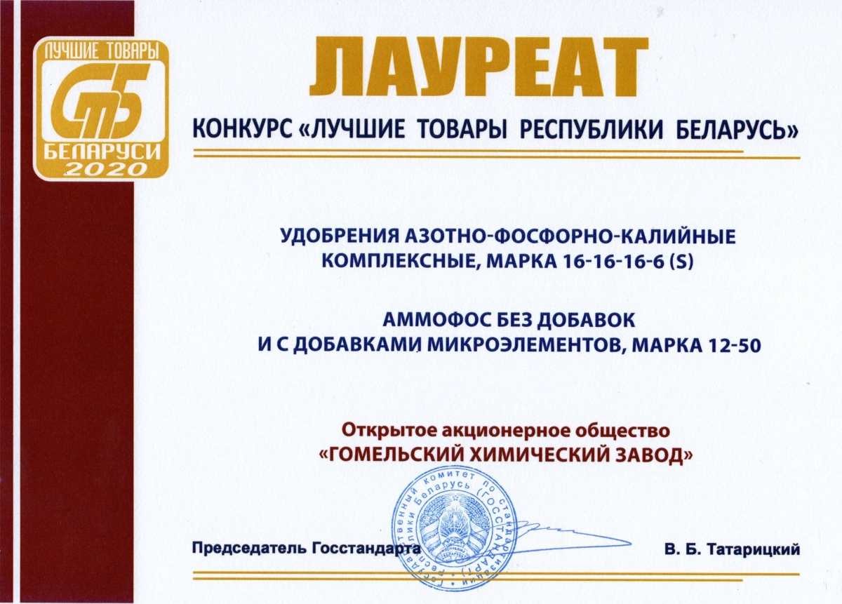 Напомним, что в этом году лучшими признали удобрения АФК марки 16-16-16-6S и аммофос без добавок и с добавками микроэлементов марки 12-50, а также удобрение АФК для льна марки 6-21-32-0,22(B)-0,30(Zn)-0,20(Fe). Еще одна награда в номинации "Стабильное качество" за устойчивые результаты в области качества.