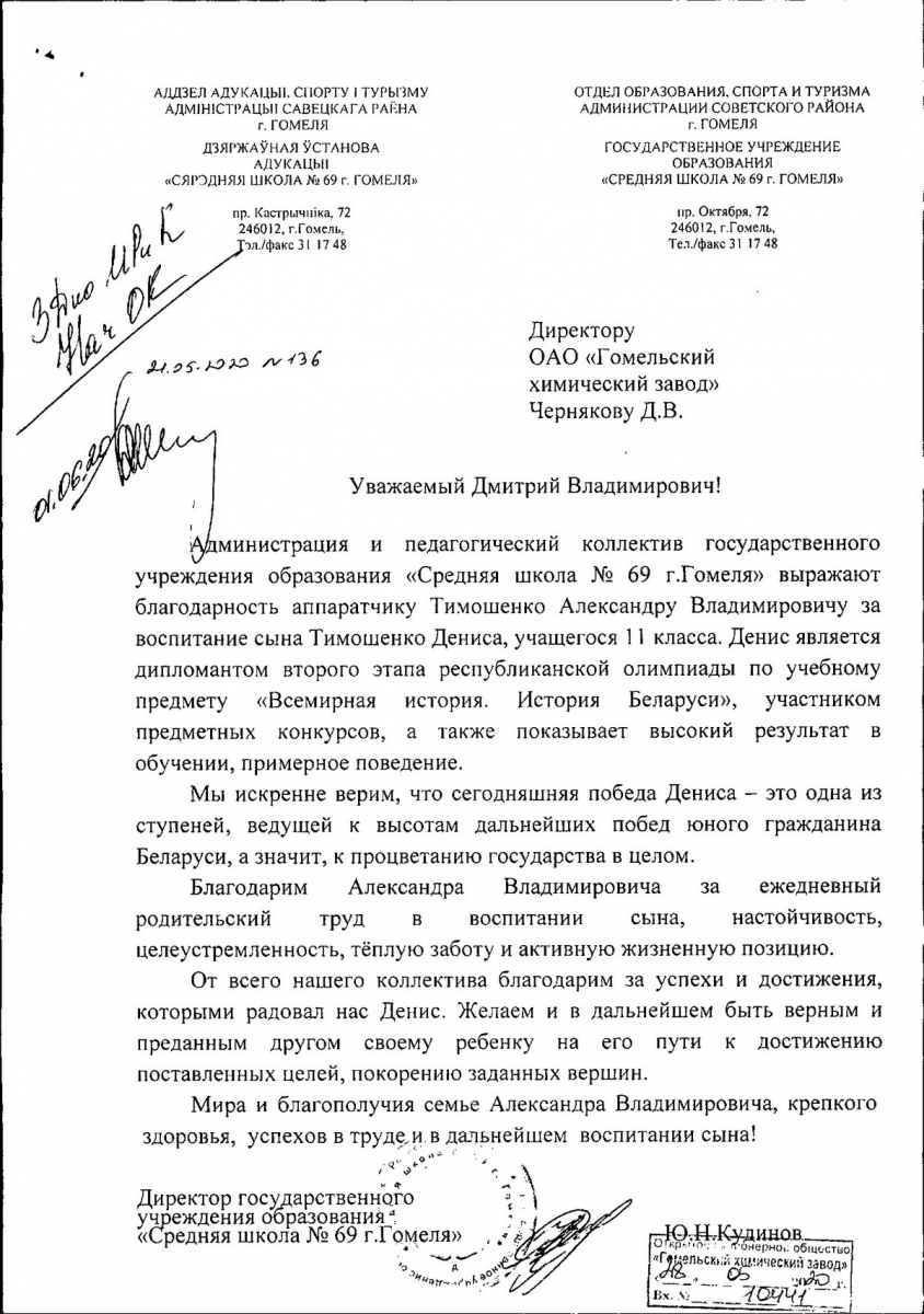 Благодарностью администрации средней школы №69 г.Гомеля за достойное воспитание сына – дипломанта второго этапа республиканской олимпиады по всемирной истории и истории Беларуси – отмечен Александр Владимирович Тимошенко, аппаратчик нейтрализации цеха гранулированного аммофоса. Высокие достижения в обучении, примерное поведение и активная жизненная позиция Дениса Тимошенко – результат кропотливого труда и заботы его родителей.
