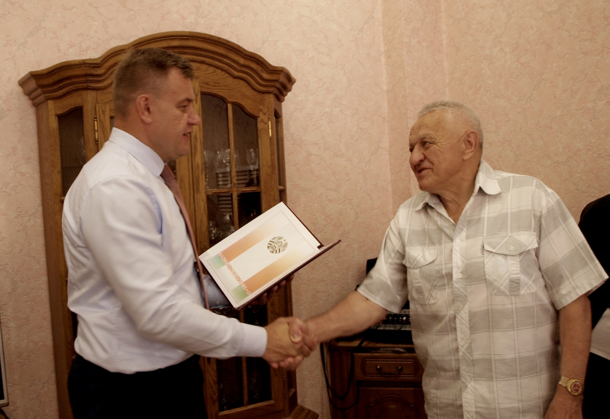 В торжественной обстановке состоялось поздравление коллег и соратников. Директор завода Черняков Д.В. вручил юбиляру почетную грамоту, памятный знак и подарки.