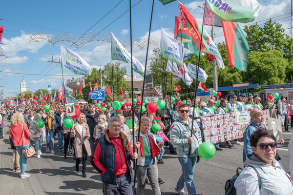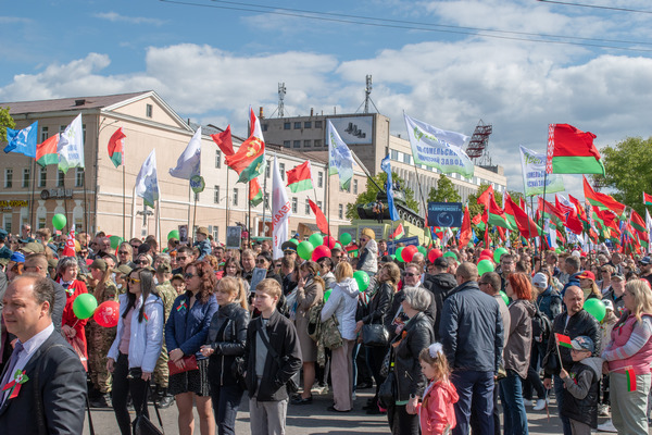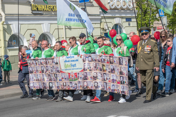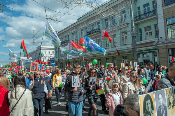 Праздничное шествие по ул.Советской. На праздник пришли целыми семьями, что говорит о незыблемой связи поколений. Участники несли в руках букеты весенних цветов, флаги, шары, портреты своих родственников, участников Великой Отечественной войны.