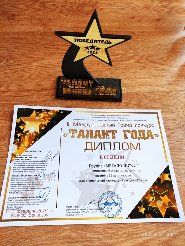 6 февраля при поддержке профсоюзного комитета Общества в рамках III Международного Гранд-конкурса «ТАЛАНТ ГОДА»2021 состоялось выступление вокально-танцевального коллектива ОАО «Гомельский химический завод» «Мегаполисы».