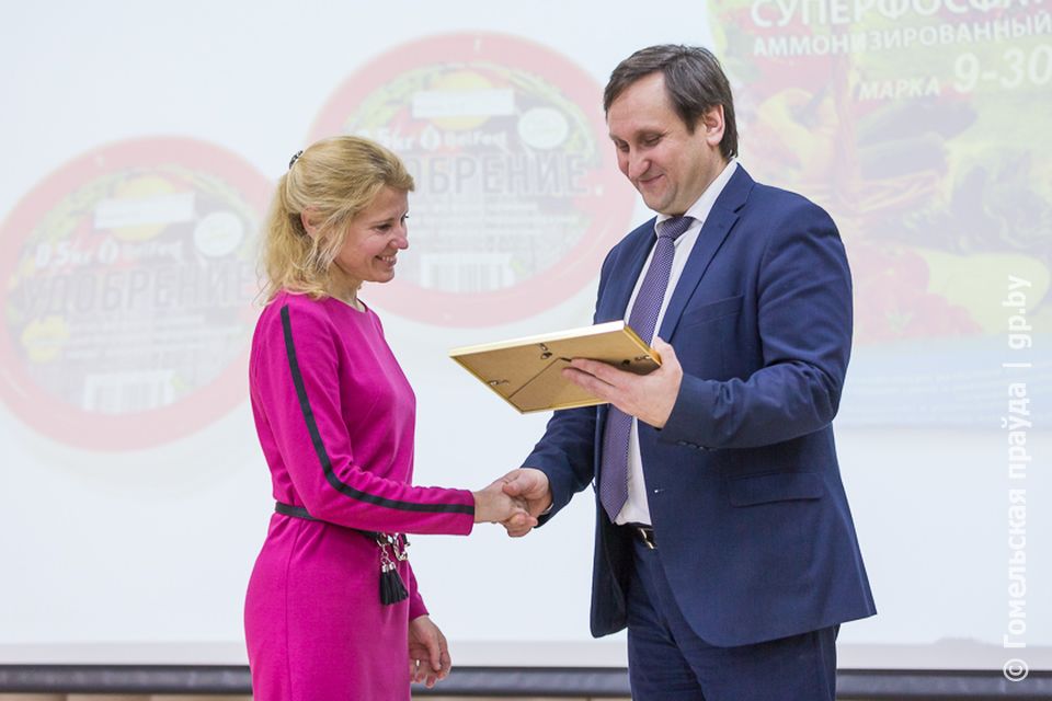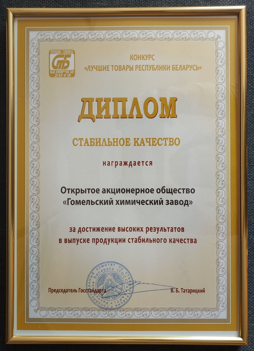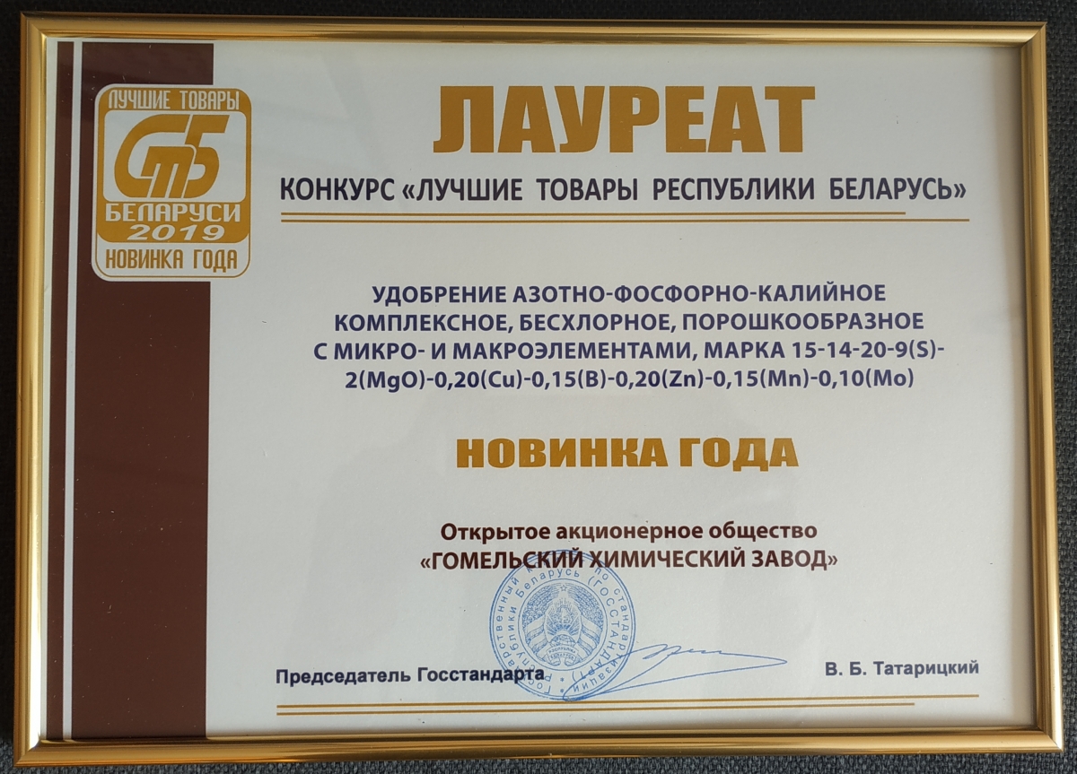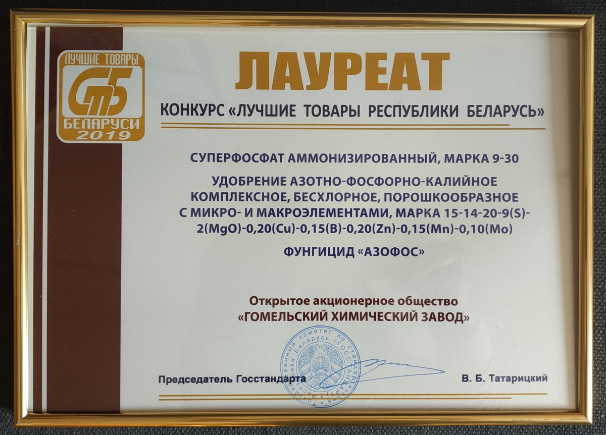 В рамках регионального дня качества ОАО "Гомельский химический завод" были вручены дипломы лауреата республиканского конкурса "Лучшие товары Республики Беларусь" за суперфосфат аммонизированный марки 9-30 и фунгицид «Азофос». Удобрение азотно-фосфорно-калийное комплексное, бесхлорное, порошкообразное с микро-и макроэлементами, марка 15-14-20-9(S)-2(MgO)-0,20(Cu)-0,15(B)-0,20(Zn)-0,15(Mn)-0,10(Mo) наряду со званием "Лучший товар" получило и звание "Новинка года".