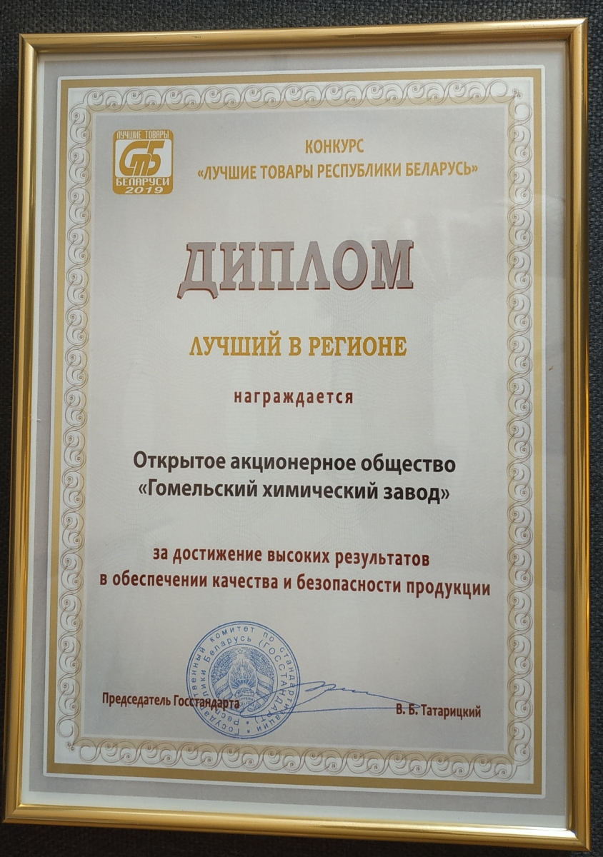 Также ОАО "Гомельский химический завод" удостоен специальной награды "Лучший в регионе" и диплома "Стабильное качество".